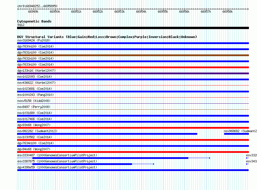 Variant DetailsVariant: dgv4398e59| Internal ID | 22765618 | | Landmark | | | Location Information | | | Cytoband | 9q12 | | Allele length | | Assembly | Allele length | | hg38 | 10699 | | hg19 | 10699 | | hg18 | 10699 |