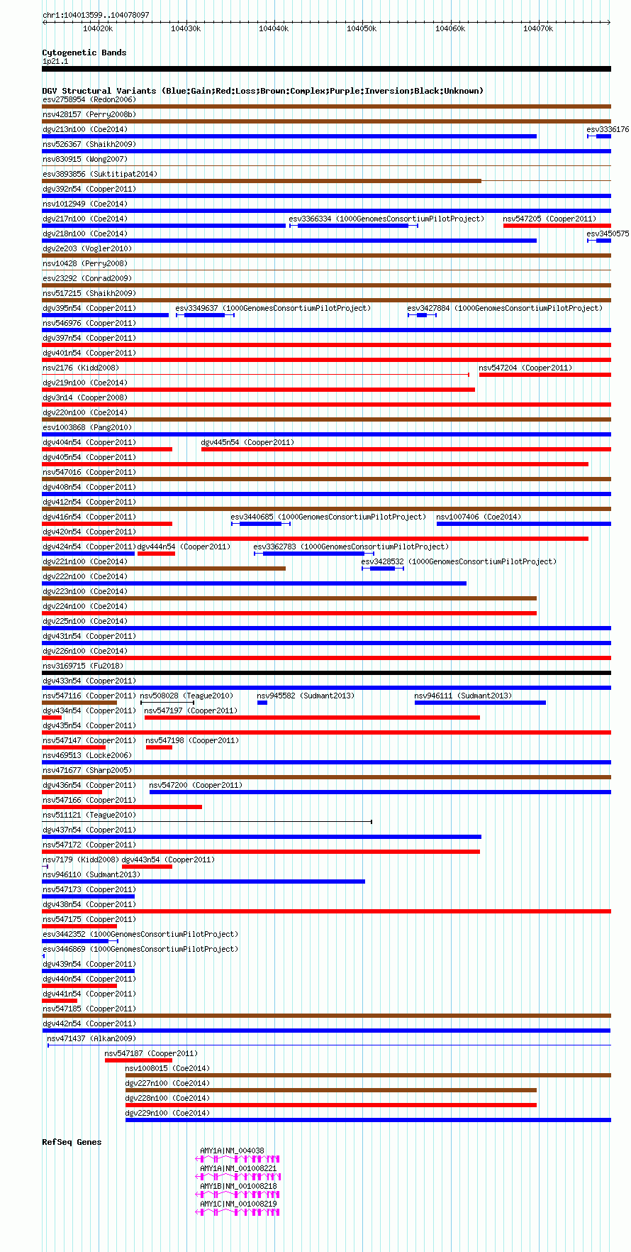 Variant DetailsVariant: dgv442n54| Internal ID | 22768337 | | Landmark | | | Location Information | | | Cytoband | 1p21.1 | | Allele length | | Assembly | Allele length | | hg38 | 64499 | | hg19 | 64499 | | hg18 | 64499 |