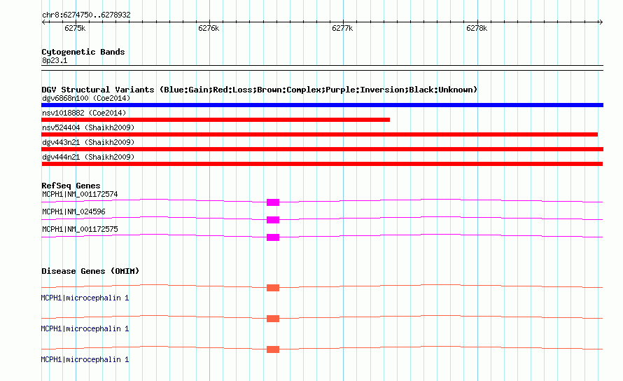 | | Variant Type | CNV loss | | Copy Number | | | Allele State | | | Allele Origin | | | Probe Count | | | Validation Flag | | | Merged Status | M | | Merged Variants | | | Supporting Variants | nsv526687, nsv517509 | | Samples | | | Known Genes | MCPH1 | | Method | SNP array | | Analysis | Sample-level CNVs | | Platform | GPL6434 | | Comments | | | Reference | Shaikh_et_al_2009 | | Pubmed ID | 19592680 | | Accession Number(s) | dgv444n21