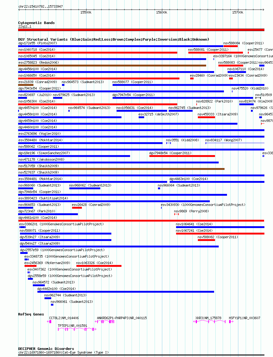 Variant DetailsVariant: dgv4461n100| Internal ID | 22790548 | | Landmark | | | Location Information | | | Cytoband | 22q11.1 | | Allele length | | Assembly | Allele length | | hg38 | 323156 | | hg19 | 323156 | | hg18 | 323156 |