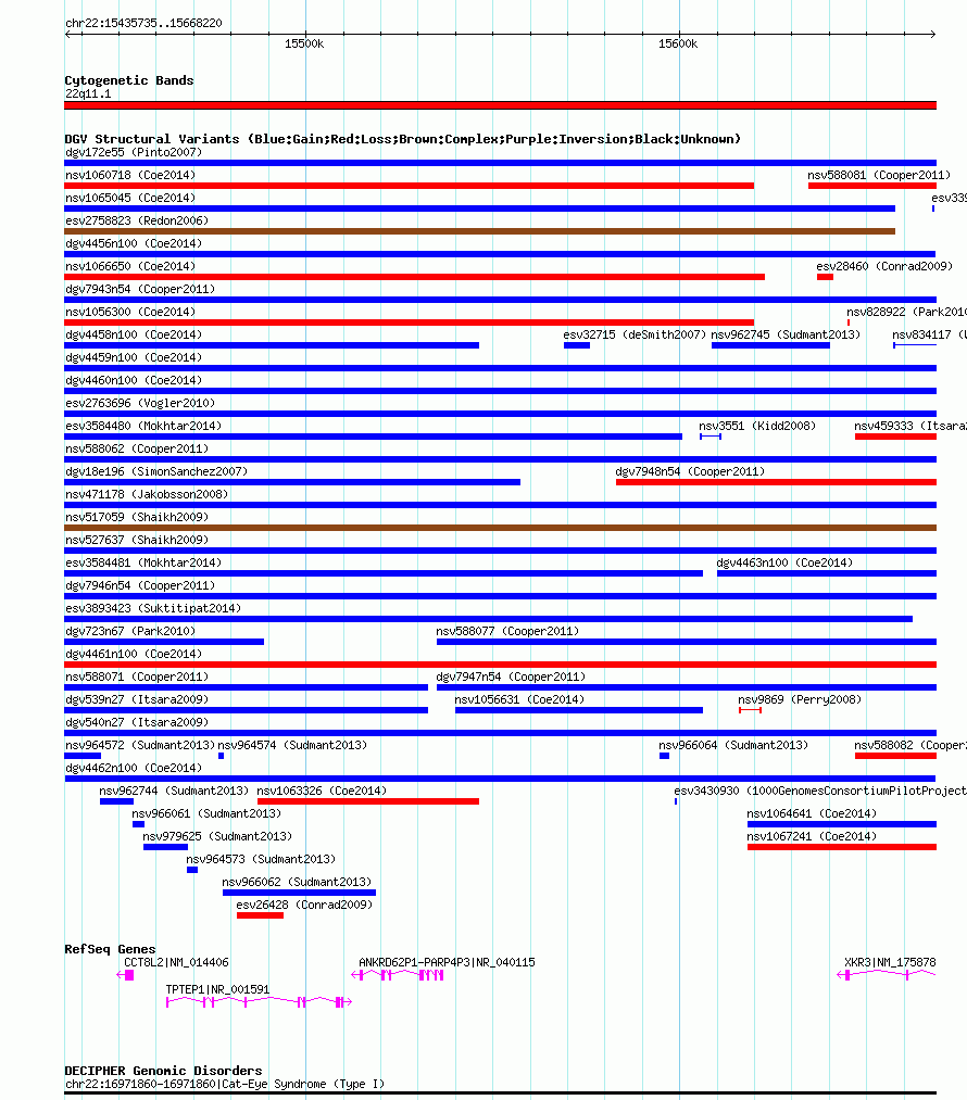 Variant DetailsVariant: dgv4462n100| Internal ID | 22790549 | | Landmark | | | Location Information | | | Cytoband | 22q11.1 | | Allele length | | Assembly | Allele length | | hg38 | 232486 | | hg19 | 232486 | | hg18 | 232486 |