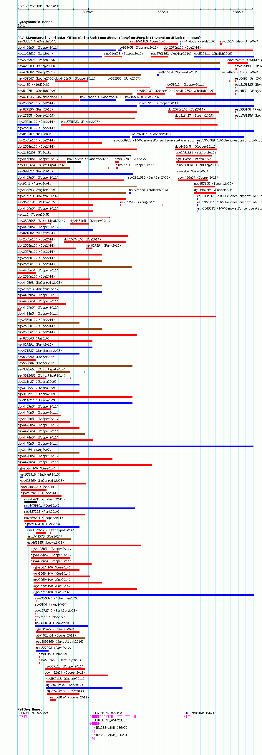 Variant DetailsVariant: dgv4475n54| Internal ID | 22772370 | | Landmark | | | Location Information | | | Cytoband | 15q14 | | Allele length | | Assembly | Allele length | | hg38 | 314263 | | hg19 | 314263 | | hg18 | 314263 |