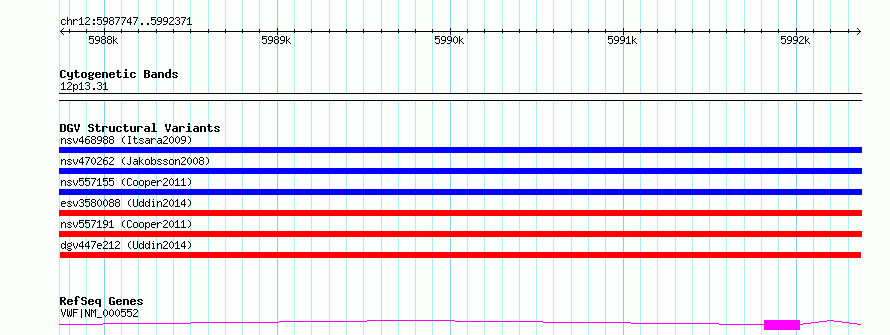 Variant DetailsVariant: dgv447e212| Internal ID | 20148903 | | Landmark | | | Location Information | | | Cytoband | 12p13.31 | | Allele length | | Assembly | Allele length | | hg38 | 4625 | | hg19 | 4625 |
