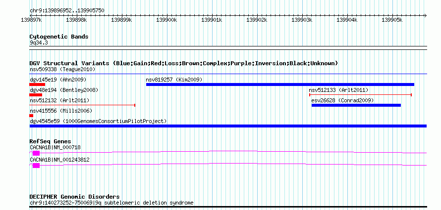Variant DetailsVariant: dgv4545e59| Internal ID | 20131294 | | Landmark | | | Location Information | | | Cytoband | 9q34.3 | | Allele length | | Assembly | Allele length | | hg38 | 8799 | | hg19 | 8799 | | hg18 | 8799 |