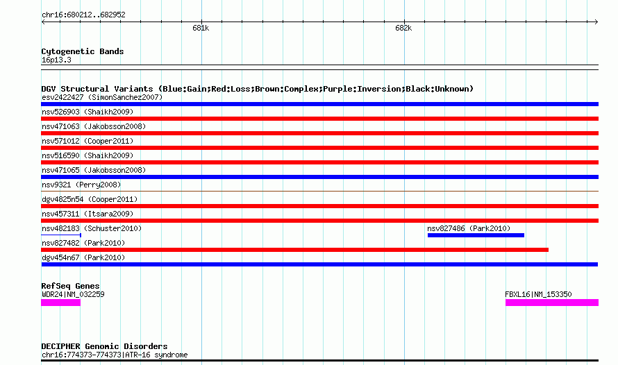 Variant DetailsVariant: dgv454n67 | Internal ID | 22781437 | | Landmark | | | Location Information | | | Cytoband | 16p13.3 | | Allele length | | Assembly | Allele length | | hg38 | 2741 | | hg19 | 2741 | | hg18 | 2741 |