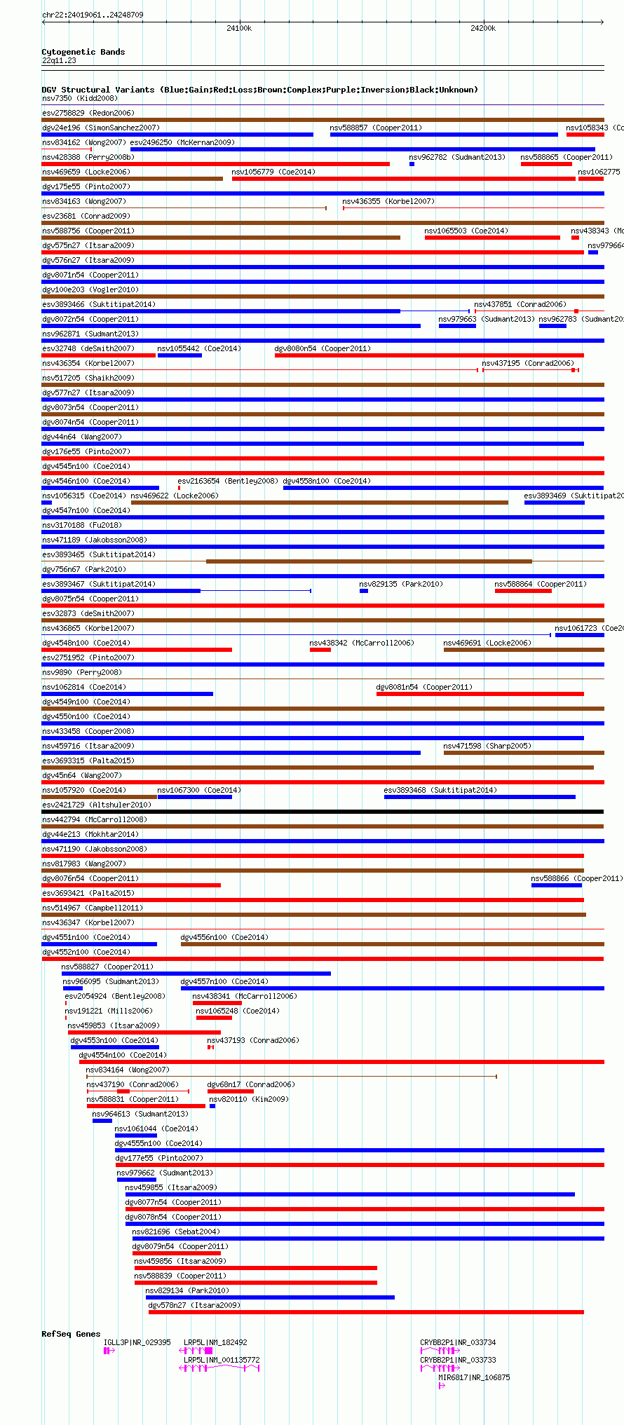 Variant DetailsVariant: dgv4552n100| Internal ID | 22790639 | | Landmark | | | Location Information | | | Cytoband | 22q11.23 | | Allele length | | Assembly | Allele length | | hg38 | 229649 | | hg19 | 229649 | | hg18 | 229649 |