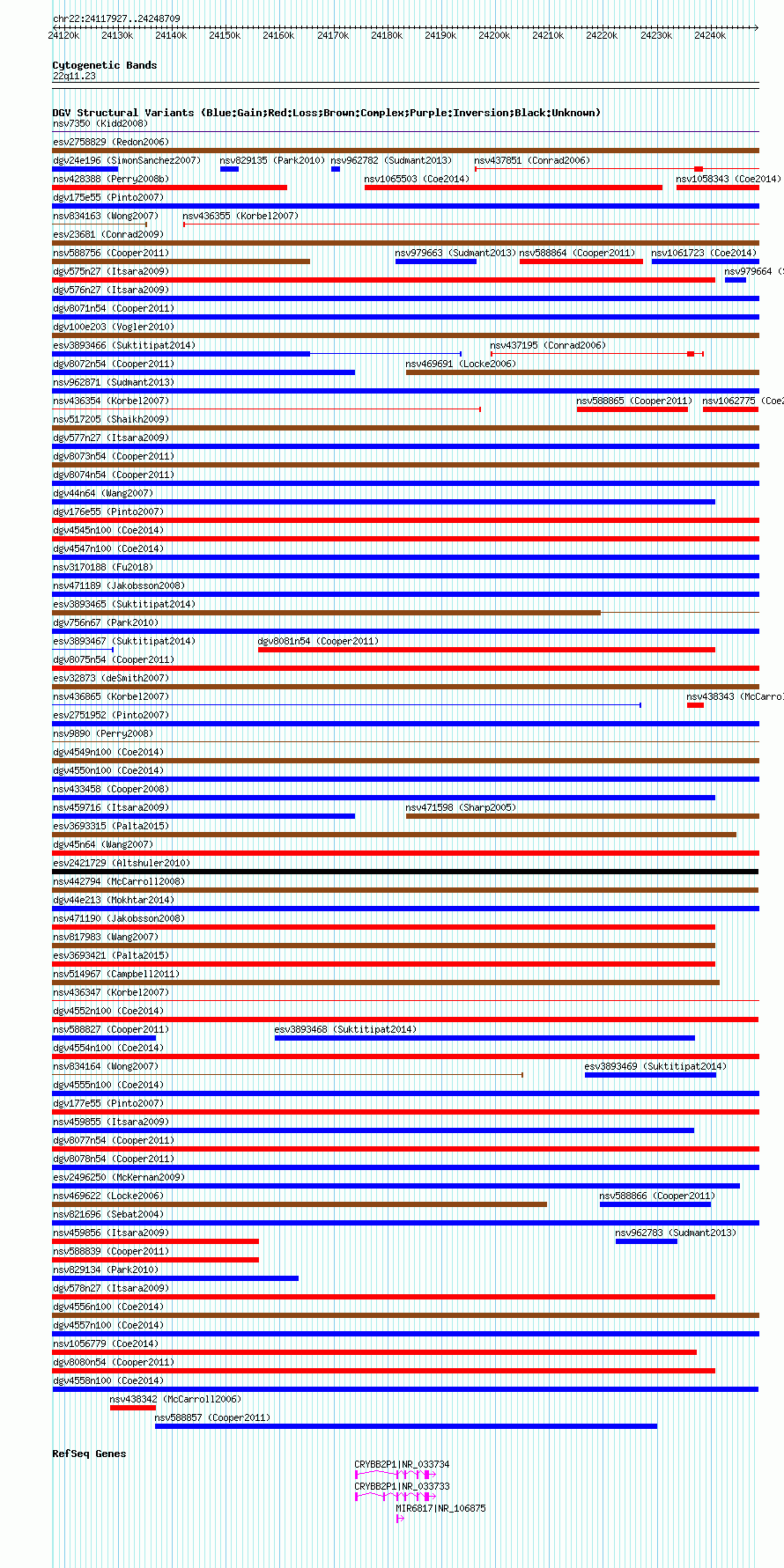 | | Variant Type | CNV gain | | Copy Number | | | Allele State | | | Allele Origin | | | Probe Count | | | Validation Flag | | | Merged Status | M | | Merged Variants | | | Supporting Variants | nsv1057623, nsv1059542, nsv1060260, nsv1056277, nsv1058551 | | Samples | | | Known Genes | CRYBB2P1, MIR6817 | | Method | SNP array | | Analysis | Affymetrix SNP array copy number analysis | | Platform | Affymetrix SNP Array 6.0 | | Comments | | | Reference | Coe_et_al_2014 | | Pubmed ID | 25217958 | | Accession Number(s) | dgv4558n100