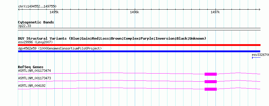 Variant DetailsVariant: dgv4562e59| Internal ID | 22765782 | | Landmark | | | Location Information | | | Cytoband | Xp22.33 | | Allele length | | Assembly | Allele length | | hg38 | 2999 | | hg19 | 2999 | | hg18 | 2999 |