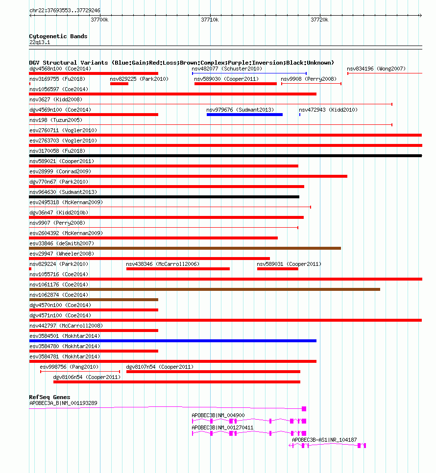 Variant DetailsVariant: dgv4571n100| Internal ID | 22790658 | | Landmark | | | Location Information | | | Cytoband | 22q13.1 | | Allele length | | Assembly | Allele length | | hg38 | 35694 | | hg19 | 35694 | | hg18 | 35694 |