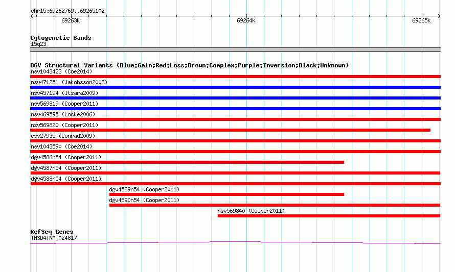 | | Variant Type | CNV loss | | Copy Number | | | Allele State | | | Allele Origin | | | Probe Count | | | Validation Flag | | | Merged Status | M | | Merged Variants | | | Supporting Variants | nsv569825, nsv569827, nsv569824, nsv569826, nsv569829 | | Samples | | | Known Genes | THSD4 | | Method | SNP array | | Analysis | Illumina SNP array copy number analysis | | Platform | Not reported | | Comments | | | Reference | Cooper_et_al_2011 | | Pubmed ID | 21841781 | | Accession Number(s) | dgv4587n54