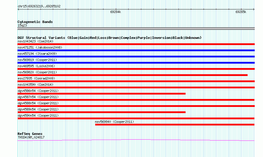 | | Variant Type | CNV loss | | Copy Number | | | Allele State | | | Allele Origin | | | Probe Count | | | Validation Flag | | | Merged Status | M | | Merged Variants | | | Supporting Variants | nsv569833, nsv569837, nsv569835, nsv569838, nsv569834, nsv569839 | | Samples | | | Known Genes | THSD4 | | Method | SNP array | | Analysis | Illumina SNP array copy number analysis | | Platform | Not reported | | Comments | | | Reference | Cooper_et_al_2011 | | Pubmed ID | 21841781 | | Accession Number(s) | dgv4590n54