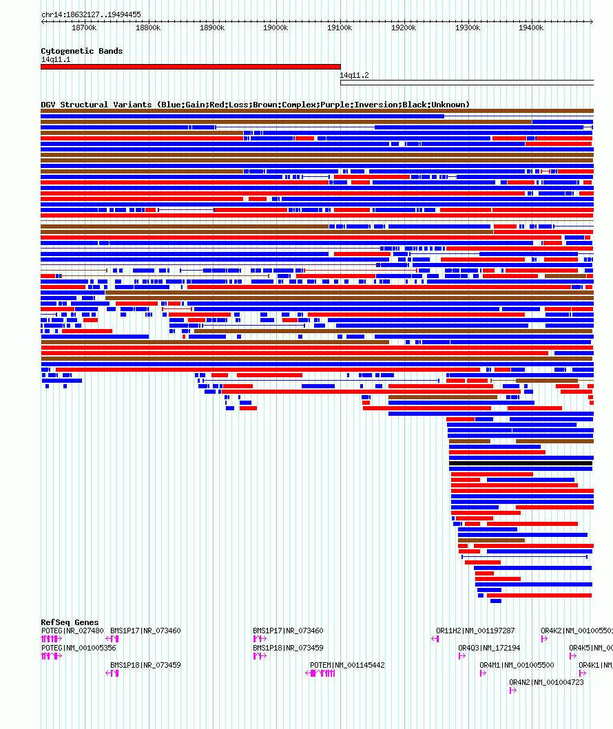 Variant DetailsVariant: dgv45e180| Internal ID | 22757455 | | Landmark | | | Location Information | | | Cytoband | 14q11.1 | | Allele length | | Assembly | Allele length | | hg38 | 980275 | | hg19 | 862489 | | hg18 | 862329 |