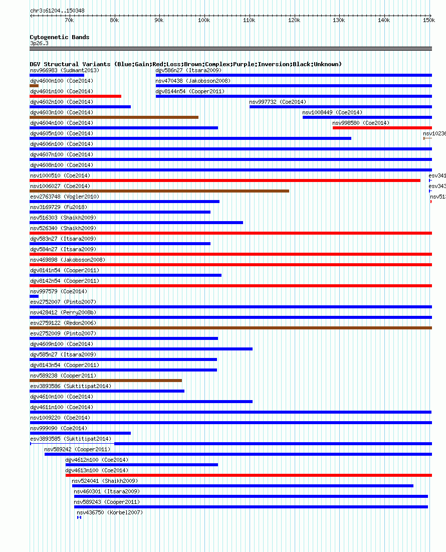 Variant DetailsVariant: dgv4611n100| Internal ID | 22790698 | | Landmark | | | Location Information | | | Cytoband | 3p26.3 | | Allele length | | Assembly | Allele length | | hg38 | 89144 | | hg19 | 89145 | | hg18 | 89145 |