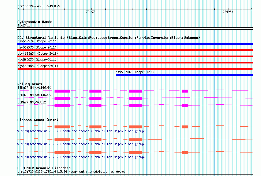 | | Variant Type | CNV loss | | Copy Number | | | Allele State | | | Allele Origin | | | Probe Count | | | Validation Flag | | | Merged Status | M | | Merged Variants | | | Supporting Variants | nsv569978, nsv569977 | | Samples | | | Known Genes | SEMA7A | | Method | SNP array | | Analysis | Illumina SNP array copy number analysis | | Platform | Not reported | | Comments | | | Reference | Cooper_et_al_2011 | | Pubmed ID | 21841781 | | Accession Number(s) | dgv4624n54