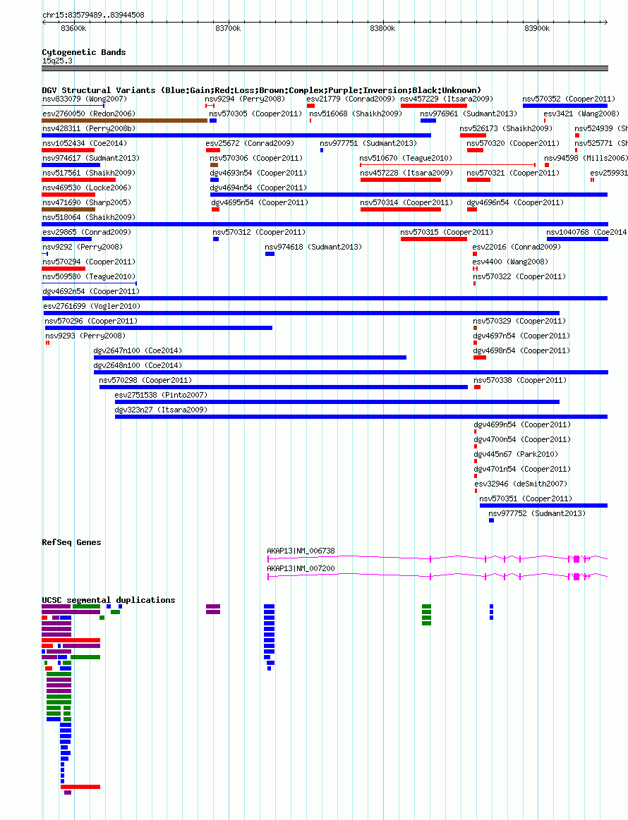 | Variant Type | CNV gain | Copy Number | | Allele State | | Allele Origin | | Probe Count | | Validation Flag | | Merged Status | M | Merged Variants | | Supporting Variants | nsv570299, nsv570302, nsv570300, nsv570297, nsv570295, nsv570301, nsv570304, nsv570303 | Samples | 1798860114_A, 1782681216_A | Known Genes | AKAP13 | Method | SNP array | Analysis | Illumina SNP array copy number analysis | Platform | Not reported | Comments | | Reference | Cooper_et_al_2011 | Pubmed ID | 21841781 | Accession Number(s) | dgv4692n54