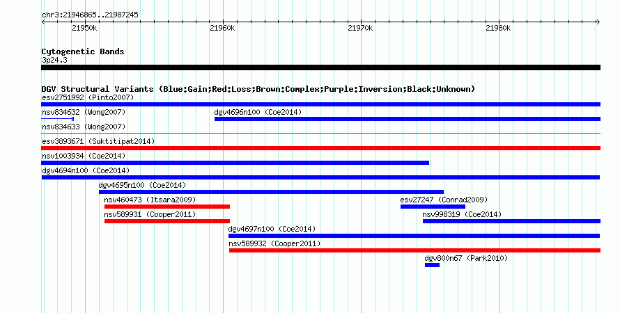 Variant DetailsVariant: dgv4694n100| Internal ID | 22790781 | | Landmark | | | Location Information | | | Cytoband | 3p24.3 | | Allele length | | Assembly | Allele length | | hg38 | 40381 | | hg19 | 40381 | | hg18 | 40381 |