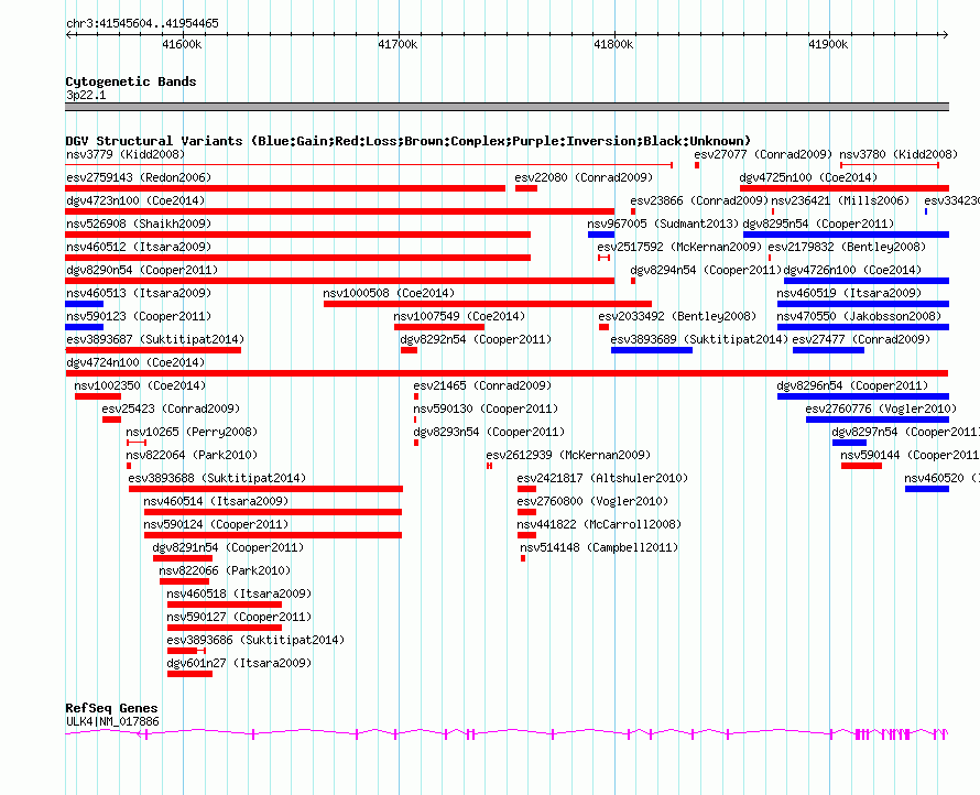 Variant DetailsVariant: dgv4724n100| Internal ID | 22790811 | | Landmark | | | Location Information | | | Cytoband | 3p22.1 | | Allele length | | Assembly | Allele length | | hg38 | 408861 | | hg19 | 408862 | | hg18 | 408862 |