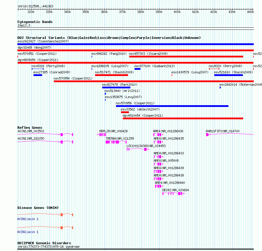| | Variant Type | CNV loss | | Copy Number | | | Allele State | | | Allele Origin | | | Probe Count | | | Validation Flag | | | Merged Status | M | | Merged Variants | | | Supporting Variants | nsv570955, nsv570953 | | Samples | | | Known Genes | AXIN1, DECR2, LOC100134368, MRPL28, NME4, RAB11FIP3, TMEM8A | | Method | SNP array | | Analysis | Illumina SNP array copy number analysis | | Platform | Not reported | | Comments | | | Reference | Cooper_et_al_2011 | | Pubmed ID | 21841781 | | Accession Number(s) | dgv4809n54