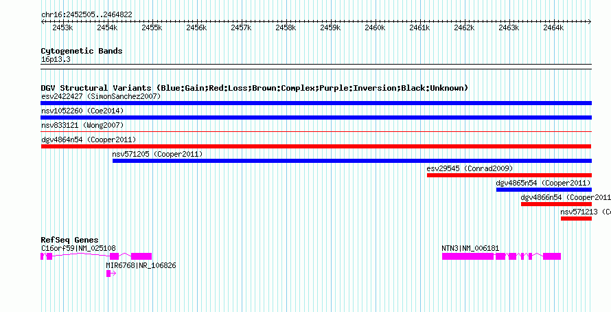 | | Variant Type | CNV loss | | Copy Number | | | Allele State | | | Allele Origin | | | Probe Count | | | Validation Flag | | | Merged Status | M | | Merged Variants | | | Supporting Variants | nsv571204, nsv571203 | | Samples | | | Known Genes | C16orf59, MIR6768, NTN3 | | Method | SNP array | | Analysis | Illumina SNP array copy number analysis | | Platform | Not reported | | Comments | | | Reference | Cooper_et_al_2011 | | Pubmed ID | 21841781 | | Accession Number(s) | dgv4864n54