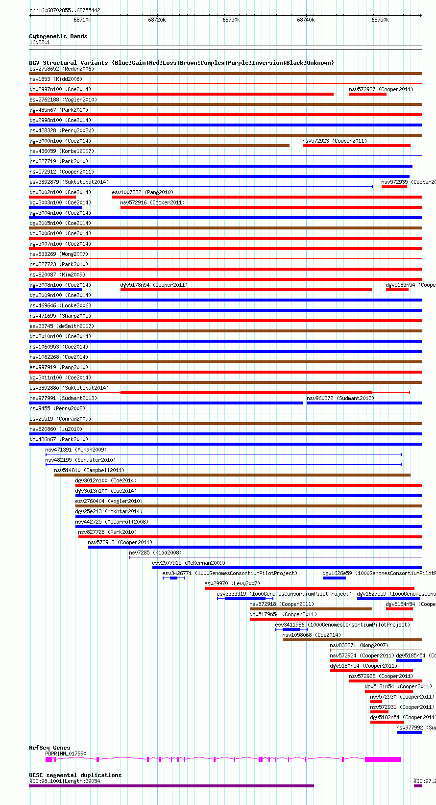 Variant DetailsVariant: dgv486n67 | Internal ID | 20146998 | | Landmark | | | Location Information | | | Cytoband | 16q22.1 | | Allele length | | Assembly | Allele length | | hg38 | 52588 | | hg19 | 52588 | | hg18 | 52588 |
