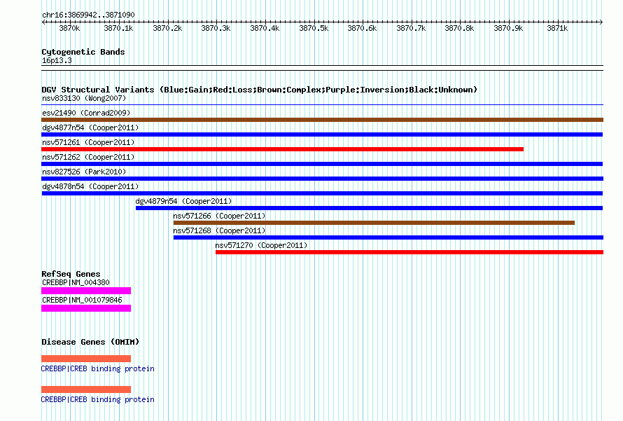 | | Variant Type | CNV gain | | Copy Number | | | Allele State | | | Allele Origin | | | Probe Count | | | Validation Flag | | | Merged Status | M | | Merged Variants | | | Supporting Variants | nsv571263, nsv571264 | | Samples | | | Known Genes | CREBBP | | Method | SNP array | | Analysis | Illumina SNP array copy number analysis | | Platform | Not reported | | Comments | | | Reference | Cooper_et_al_2011 | | Pubmed ID | 21841781 | | Accession Number(s) | dgv4878n54