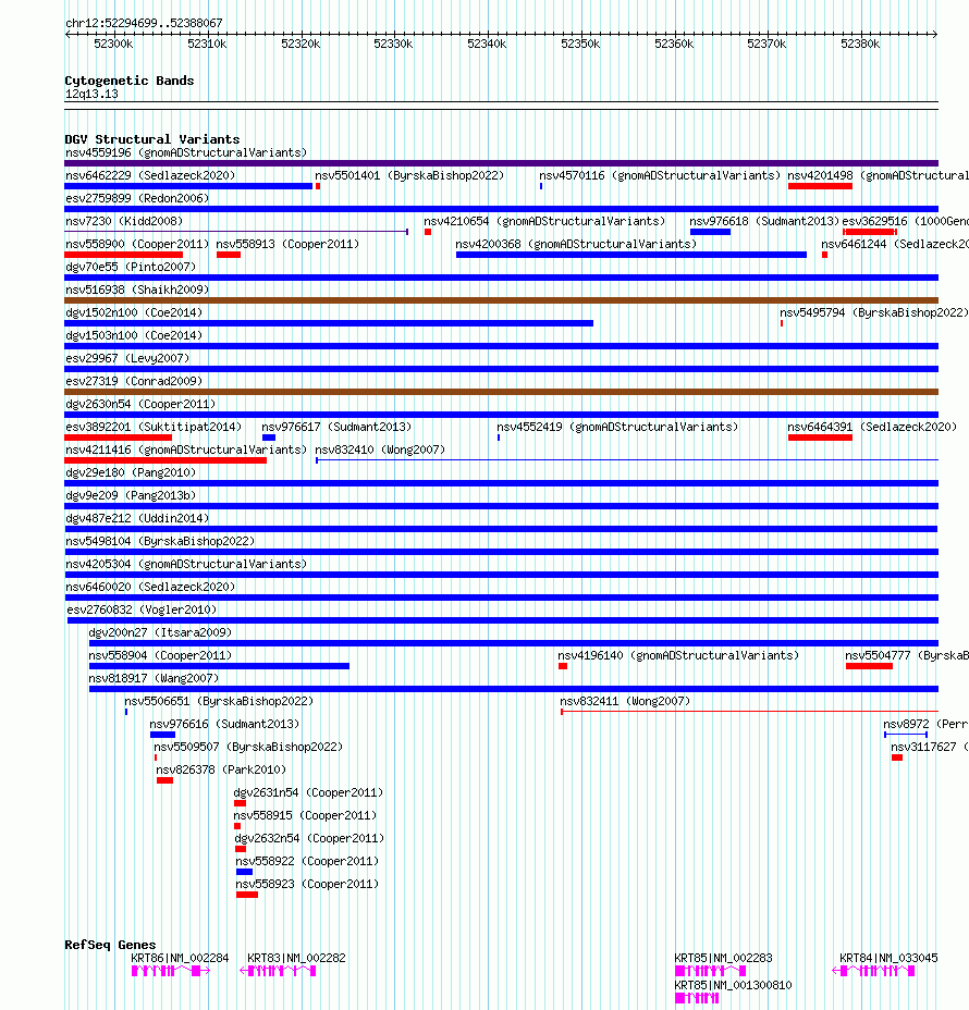 Variant DetailsVariant: dgv487e212| Internal ID | 22783414 | | Landmark | | | Location Information | | | Cytoband | 12q13.13 | | Allele length | | Assembly | Allele length | | hg38 | 93369 | | hg19 | 93369 |