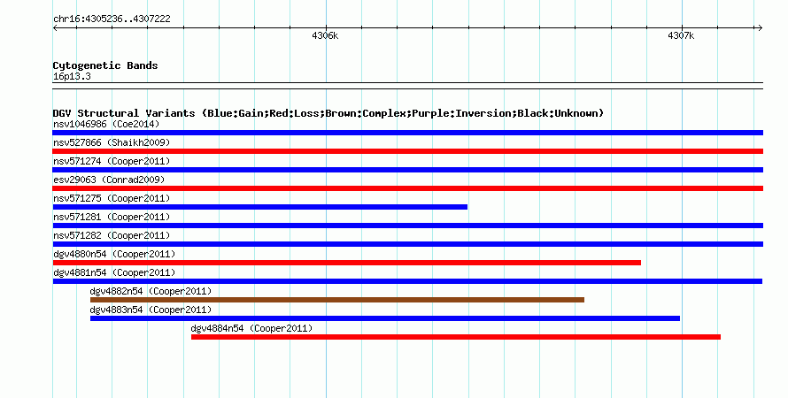 Variant DetailsVariant: dgv4881n54| Internal ID | 22772776 | | Landmark | | | Location Information | | | Cytoband | 16p13.3 | | Allele length | | Assembly | Allele length | | hg38 | 1987 | | hg19 | 1987 | | hg18 | 1987 |