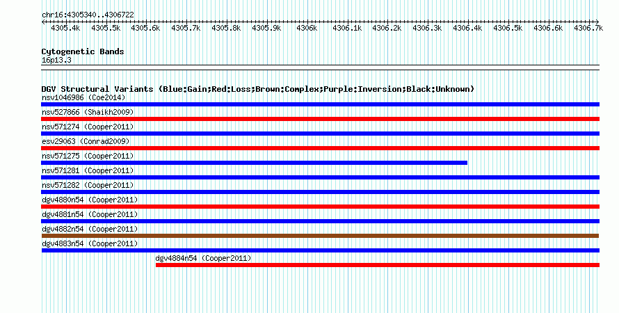 Variant DetailsVariant: dgv4882n54| Internal ID | 22772777 | | Landmark | | | Location Information | | | Cytoband | 16p13.3 | | Allele length | | Assembly | Allele length | | hg38 | 1383 | | hg19 | 1383 | | hg18 | 1383 |