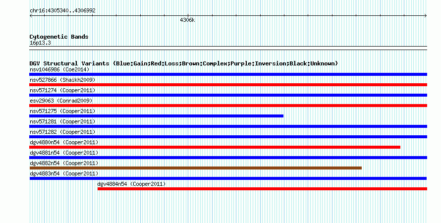 Variant DetailsVariant: dgv4883n54| Internal ID | 22772778 | | Landmark | | | Location Information | | | Cytoband | 16p13.3 | | Allele length | | Assembly | Allele length | | hg38 | 1653 | | hg19 | 1653 | | hg18 | 1653 |