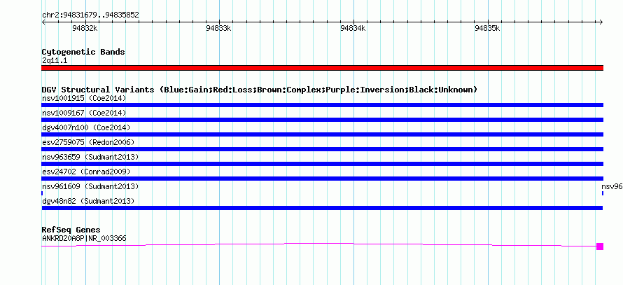 Variant DetailsVariant: dgv48n82| Internal ID | 22782882 | | Landmark | | | Location Information | | | Cytoband | 2q11.1 | | Allele length | | Assembly | Allele length | | hg38 | 4174 | | hg19 | 4174 | | hg18 | 4174 |