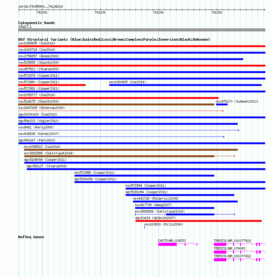Variant DetailsVariant: dgv491n67 | Internal ID | 20147003 | | Landmark | | | Location Information | | | Cytoband | 16q23.1 | | Allele length | | Assembly | Allele length | | hg38 | 42272 | | hg19 | 42272 | | hg18 | 42272 |