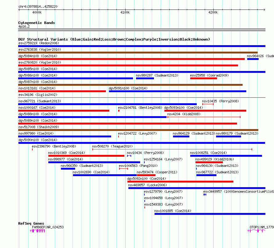 Variant DetailsVariant: dgv5090n100| Internal ID | 22791177 | | Landmark | | | Location Information | | | Cytoband | 4p16.2 | | Allele length | | Assembly | Allele length | | hg38 | 279433 | | hg19 | 279433 | | hg18 | 279407 |