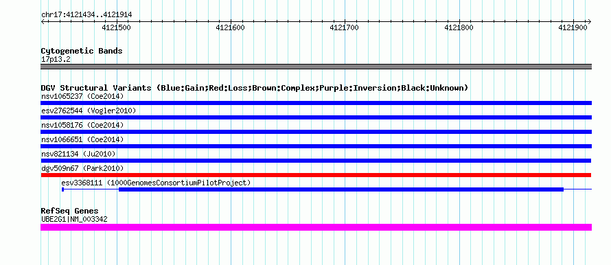 Variant DetailsVariant: dgv509n67 | Internal ID | 22781492 | | Landmark | | | Location Information | | | Cytoband | 17p13.2 | | Allele length | | Assembly | Allele length | | hg38 | 481 | | hg19 | 481 | | hg18 | 481 |