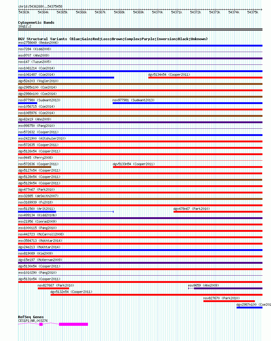 Variant DetailsVariant: dgv5131n54| Internal ID | 22773026 | | Landmark | | | Location Information | | | Cytoband | 16q12.2 | | Allele length | | Assembly | Allele length | | hg38 | 12779 | | hg19 | 12779 | | hg18 | 12779 |