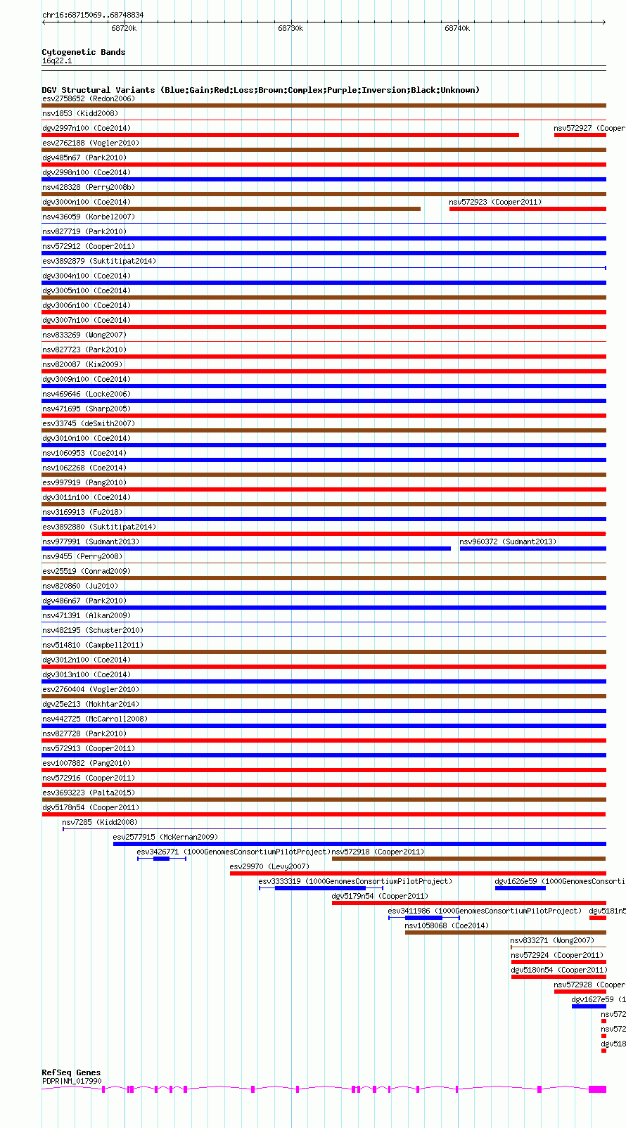 Variant DetailsVariant: dgv5178n54| Internal ID | 22773073 | | Landmark | | | Location Information | | | Cytoband | 16q22.1 | | Allele length | | Assembly | Allele length | | hg38 | 33766 | | hg19 | 33766 | | hg18 | 33766 |