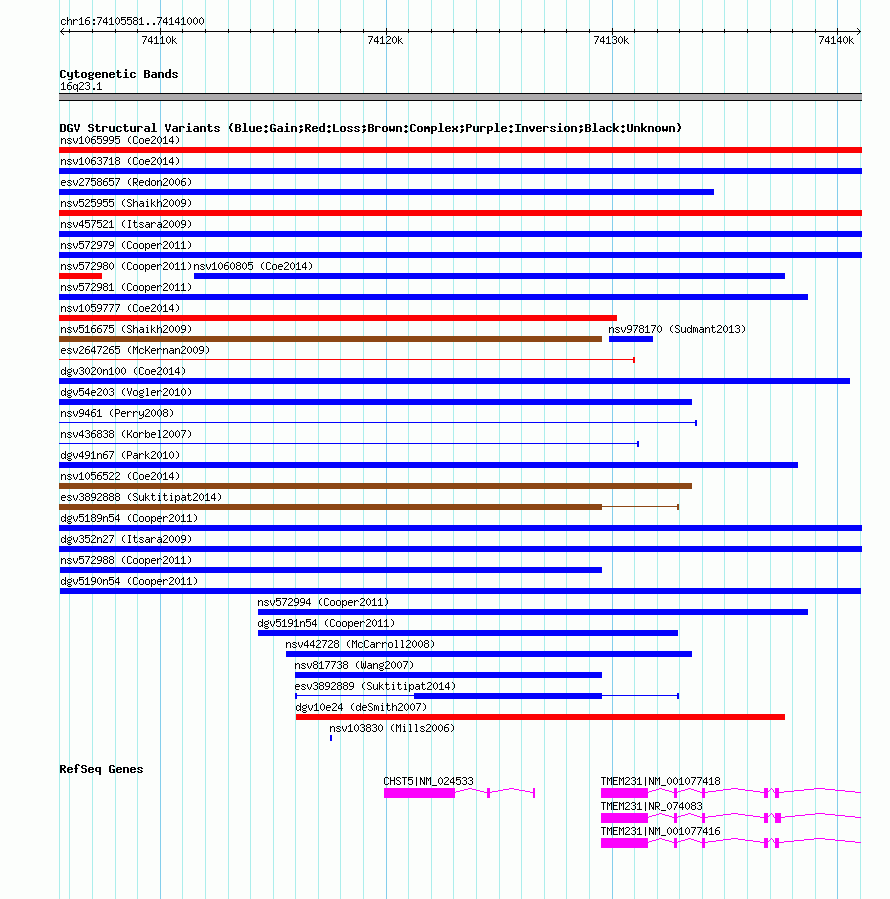 Variant DetailsVariant: dgv5190n54| Internal ID | 20138614 | | Landmark | | | Location Information | | | Cytoband | 16q23.1 | | Allele length | | Assembly | Allele length | | hg38 | 35420 | | hg19 | 35420 | | hg18 | 35420 |