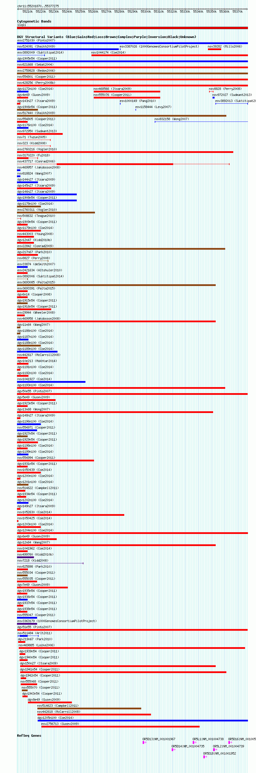 Variant DetailsVariant: dgv51e55| Internal ID | 22761001 | | Landmark | | | Location Information | | | Cytoband | 11q11 | | Allele length | | Assembly | Allele length | | hg38 | 175406 | | hg19 | 175406 | | hg18 | 175406 | | hg17 | 175406 |