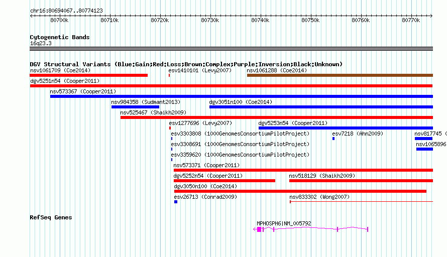 Variant DetailsVariant: dgv5251n54| Internal ID | 22773146 | | Landmark | | | Location Information | | | Cytoband | 16q23.3 | | Allele length | | Assembly | Allele length | | hg38 | 80057 | | hg19 | 80057 | | hg18 | 80057 |