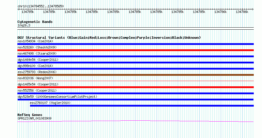 Variant DetailsVariant: dgv528e59| Internal ID | 22761748 | | Landmark | | | Location Information | | | Cytoband | 10q26.3 | | Allele length | | Assembly | Allele length | | hg38 | 1099 | | hg19 | 1099 | | hg18 | 1099 |
