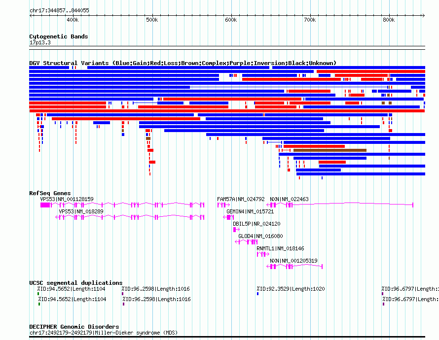 Variant DetailsVariant: dgv5387n54| Internal ID | 20138811 | | Landmark | | | Location Information | | | Cytoband | 17p13.3 | | Allele length | | Assembly | Allele length | | hg38 | 499199 | | hg19 | 499199 | | hg18 | 499199 |