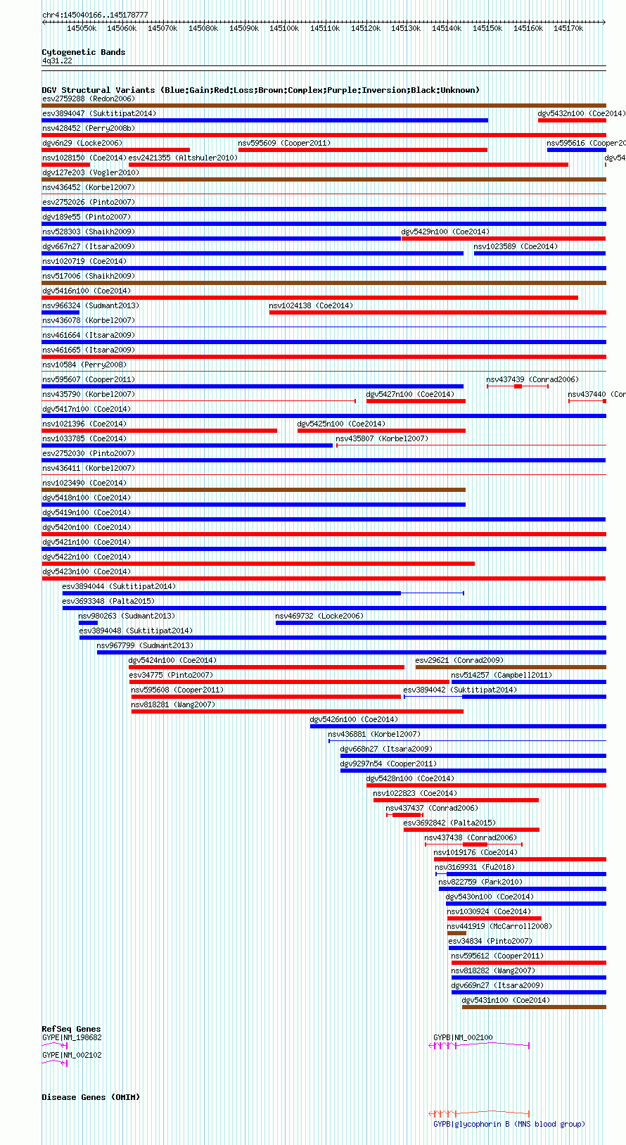 | | Variant Type | CNV loss | | Copy Number | | | Allele State | | | Allele Origin | | | Probe Count | | | Validation Flag | | | Merged Status | M | | Merged Variants | | | Supporting Variants | nsv1026426, nsv1027640, nsv1016513, nsv1020872, nsv1032683, nsv1018177, nsv1018776, nsv1030399, nsv1028525, nsv1023023, nsv1018927, nsv1031960, nsv1033776, nsv1030058, nsv1023960, nsv1020977, nsv1019910 | | Samples | | | Known Genes | GYPB, GYPE | | Method | SNP array | | Analysis | Affymetrix SNP array copy number analysis | | Platform | Affymetrix SNP Array 6.0 | | Comments | | | Reference | Coe_et_al_2014 | | Pubmed ID | 25217958 | | Accession Number(s) | dgv5423n100