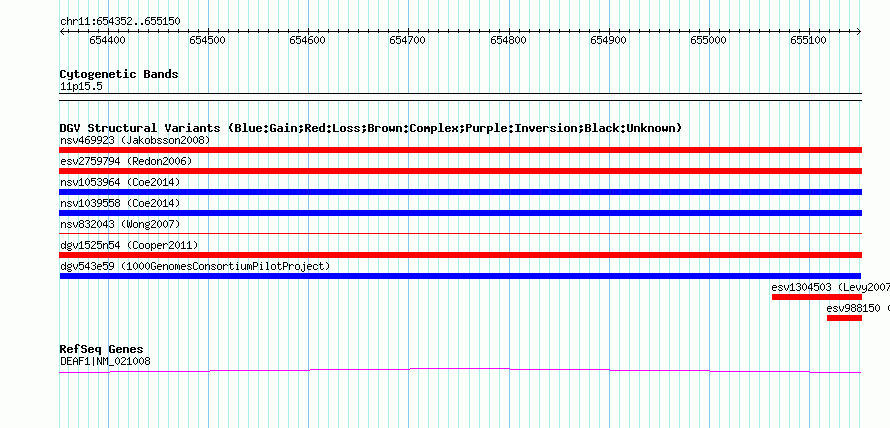 Variant DetailsVariant: dgv543e59| Internal ID | 22761763 | | Landmark | | | Location Information | | | Cytoband | 11p15.5 | | Allele length | | Assembly | Allele length | | hg38 | 799 | | hg19 | 799 | | hg18 | 799 |