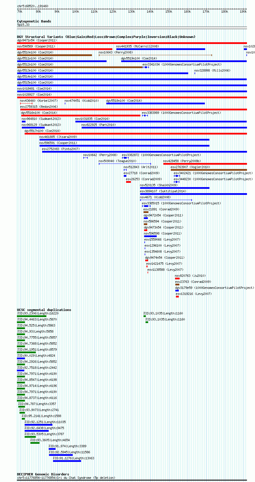 Variant DetailsVariant: dgv5514n100| Internal ID | 20157130 | | Landmark | | | Location Information | | | Cytoband | 5p15.33 | | Allele length | | Assembly | Allele length | | hg38 | 122826 | | hg19 | 122941 | | hg18 | 122941 |