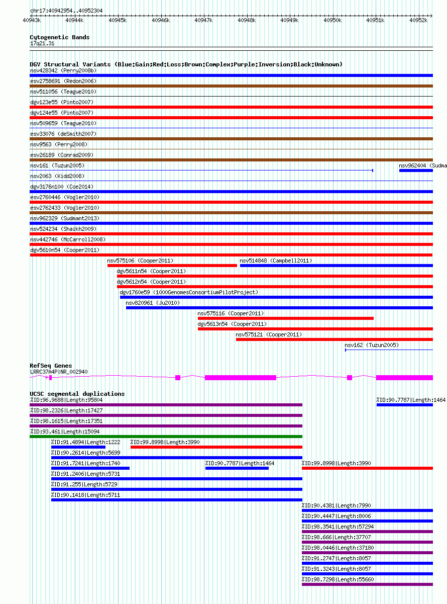 Variant DetailsVariant: dgv5610n54Internal ID | 20139034 | Landmark | | Location Information | | Cytoband | 17q21.31 | Allele length | Assembly | Allele length | hg38 | 9351 | hg19 | 9351 | hg18 | 9351 |