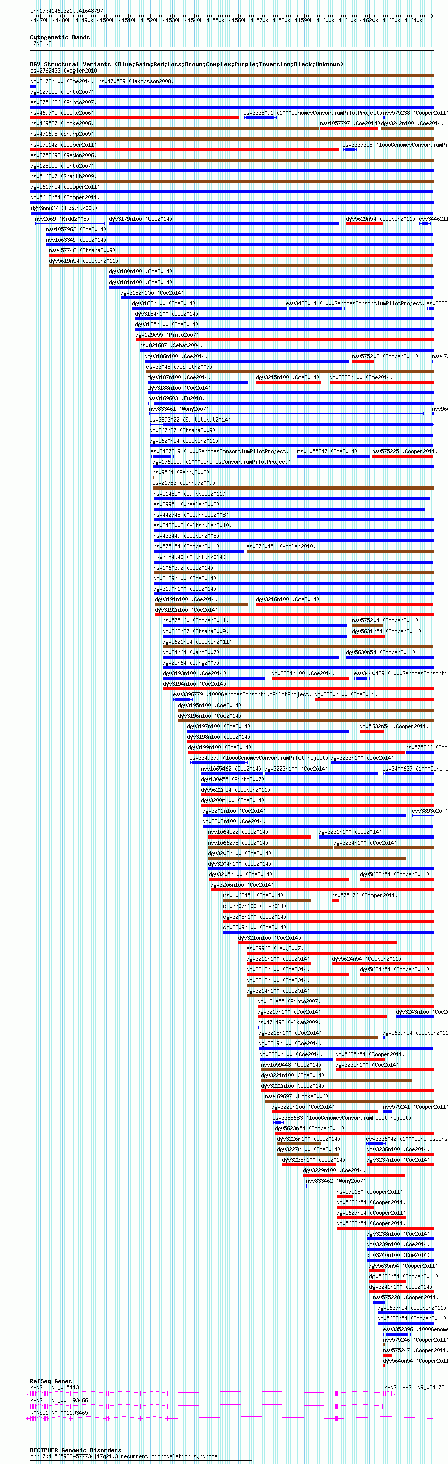 Variant DetailsVariant: dgv5617n54| Internal ID | 22773512 | | Landmark | | | Location Information | | | Cytoband | 17q21.31 | | Allele length | | Assembly | Allele length | | hg38 | 183547 | | hg19 | 183547 | | hg18 | 183477 |