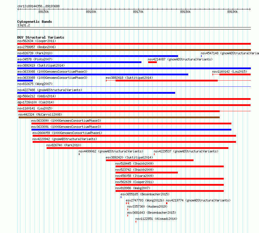 Variant DetailsVariant: dgv566e212Internal ID | 20149022 | Landmark | | Location Information | | Cytoband | 13q31.2 | Allele length | Assembly | Allele length | hg38 | 49331 | hg19 | 49331 |