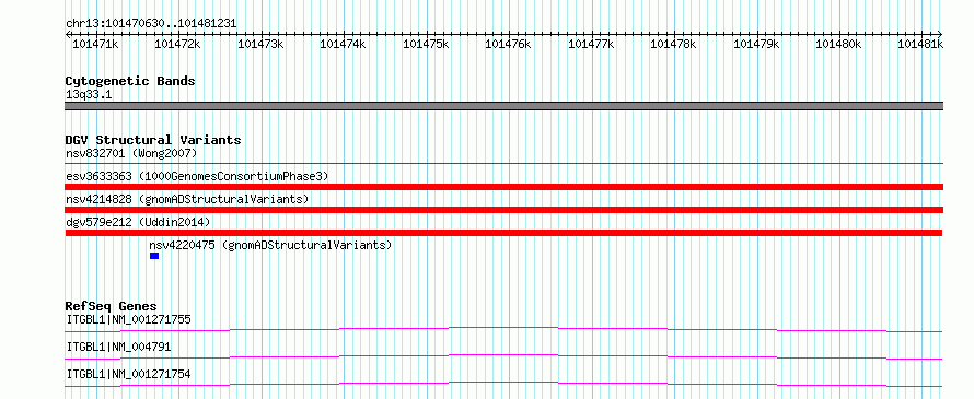 Variant DetailsVariant: dgv579e212| Internal ID | 20149035 | | Landmark | | | Location Information | | | Cytoband | 13q33.1 | | Allele length | | Assembly | Allele length | | hg38 | 10602 | | hg19 | 10602 |