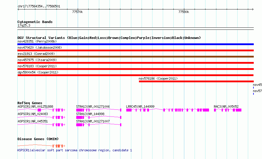 | | Variant Type | CNV loss | | Copy Number | | | Allele State | | | Allele Origin | | | Probe Count | | | Validation Flag | | | Merged Status | M | | Merged Variants | | | Supporting Variants | nsv576185, nsv576184 | | Samples | | | Known Genes | ASPSCR1, LRRC45, RAC3, STRA13 | | Method | SNP array | | Analysis | Illumina SNP array copy number analysis | | Platform | Not reported | | Comments | | | Reference | Cooper_et_al_2011 | | Pubmed ID | 21841781 | | Accession Number(s) | dgv5800n54