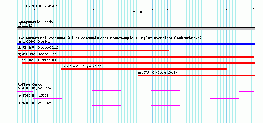 Variant DetailsVariant: dgv5847n54| Internal ID | 22773742 | | Landmark | | | Location Information | | | Cytoband | 18p11.22 | | Allele length | | Assembly | Allele length | | hg38 | 1600 | | hg19 | 1600 | | hg18 | 1600 |