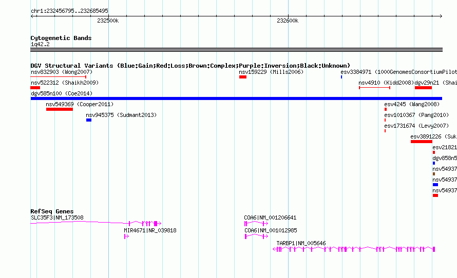 Variant DetailsVariant: dgv585n100| Internal ID | 22786672 | | Landmark | | | Location Information | | | Cytoband | 1q42.2 | | Allele length | | Assembly | Allele length | | hg38 | 228701 | | hg19 | 228701 | | hg18 | 228701 |